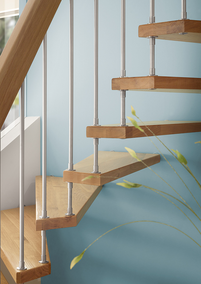 Die Systemtreppe beschränkt sich auf das Wesentliche: nämlich auf Stufen und Geländer. Damit ist sie ein echter Meilenstein im Treppenbau. Mit einer bis dahin nicht gekannten Fülle von Vorteilen und einer Vielzahl von Variationsmöglichkeiten.