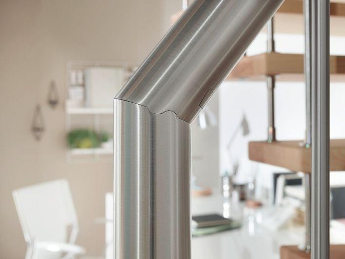 Während der Handlauf der Systemtreppe mit Holzhandlauf imposant erscheinen mag, ist der Edelstahlhandlauf viel dünner und wirkt leicht und elegant.
